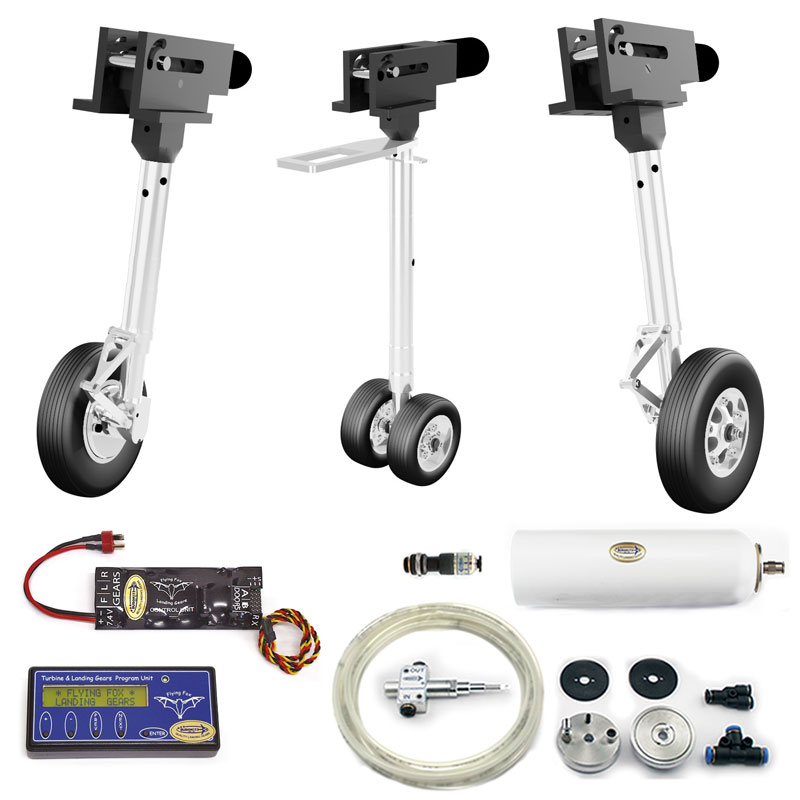Complete with electric actuators, "Oleolegs" oil shock absorber legs, air brakes, wheels with aluminum rims, control unit for retracts and hatches, program unit for control unit.
